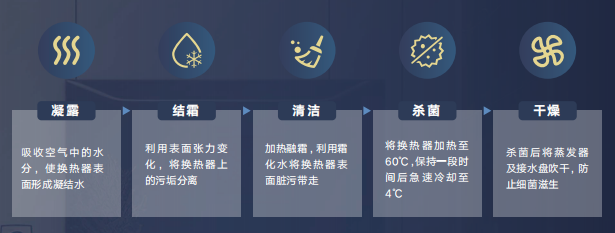 相变分离自清洁:通过凝露、结霜、清洁、杀菌、干燥五步曲,自动清洁蒸发器;
